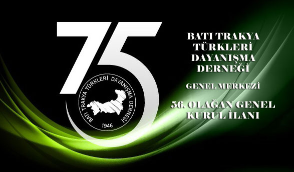 Batı Trakya Türkleri Dayanışma Derneği Genel Merkezi 56. Olağan Genel Kurul Toplantısı 27.03.2022 Pazar günü saat 11.00’de Leyla Gencer Opera ve Sanat Merkezi Osmaniye Mahallesi İncirli Yolu Sokak No: 27/31 Bakırköy – İstanbul adresinde yapılacaktır.
