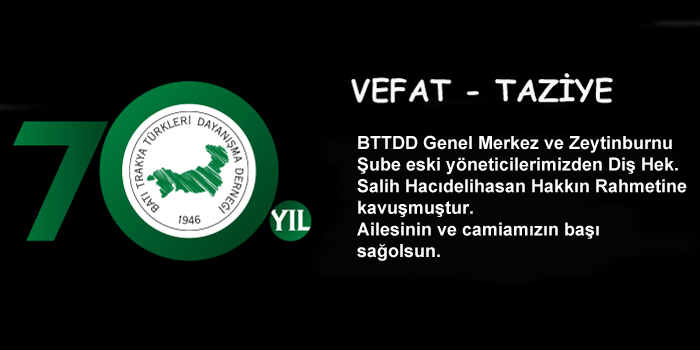 Batı Trakya Türkleri Dayanışma Derneği Genel Merkez İkinci Başkanımız ve Zeytinburnu Şube eski Başkanlarından Diş Hekimi Salih Hacıdelihasan Hakkın Rahmetine kavuştu.