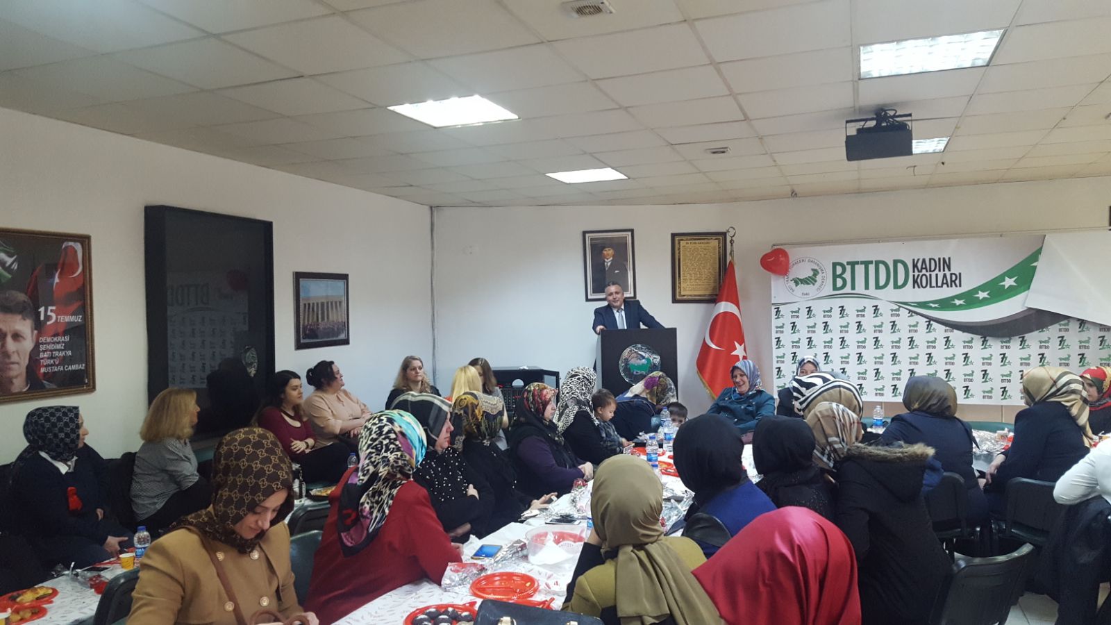 Genel Başkan Av.Necmettin Hüseyin yaptığı konuşmada: “Öncelikle hepinizin 8 Mart Dünya Emekçi Kadınlar Gününü kutluyorum. Baş tacımız olan kadınlarımızın Kadın Kollarımıza verdiği destek ile bugün burada 100’ aşkın kadını, geçtiğimiz günlerde Bursa’da 800 kişilik kadın topluluğunu bir arada gördük. İzmit ve Soma şubemizde yapılan faaliyetlerimiz ile de artık yüzlerle ifade edilen katılımlarla etkinliklerin gerçekleştiğini görüyoruz. Sizlere bugün buradan önümüzdeki ay içerisinde İzmit’te toplayacağımız en az bin kişilik kurultayımızla sadece ve sadece sizlerin yaşadığı sorunların enine boyuna tartışılacağı kurultayın gerçekleştireceğimizin müjdesini vermek istiyorum. Geçtiğimiz günlerde tüm şehirlerdeki Kadın Kollarımız ile Bursa’da bir araya gelerek bu kurultaya ilişkin hazırlıkları değerlendirdik. Yaşamınızın içindeki her alana dair konuların tartışılma imkanı bulmasını istiyoruz. Bugüne kadar yapılan beş tane uluslar arası büyük kurultayımız oldu ancak bu kurultaylarımıza maalesef Batı Trakya Kadınını tam anlamıyla taşıyamamıştık. Bu kez kadın kurultayımızın sonucu ile oluşacak sağlam bir zeminde bir komisyonunda sadece ve sadece bu konuya özgülenmesini sağlayacağız. Geçmişte bunun yapılmamış olmasını bir eksiklik olarak görüyoruz” dedi.