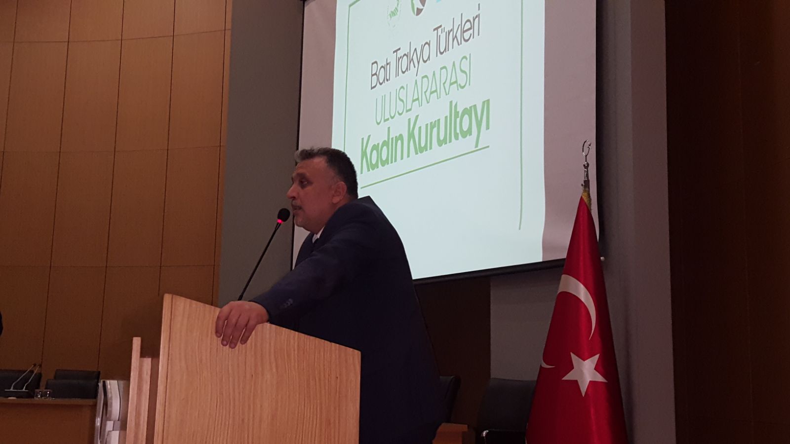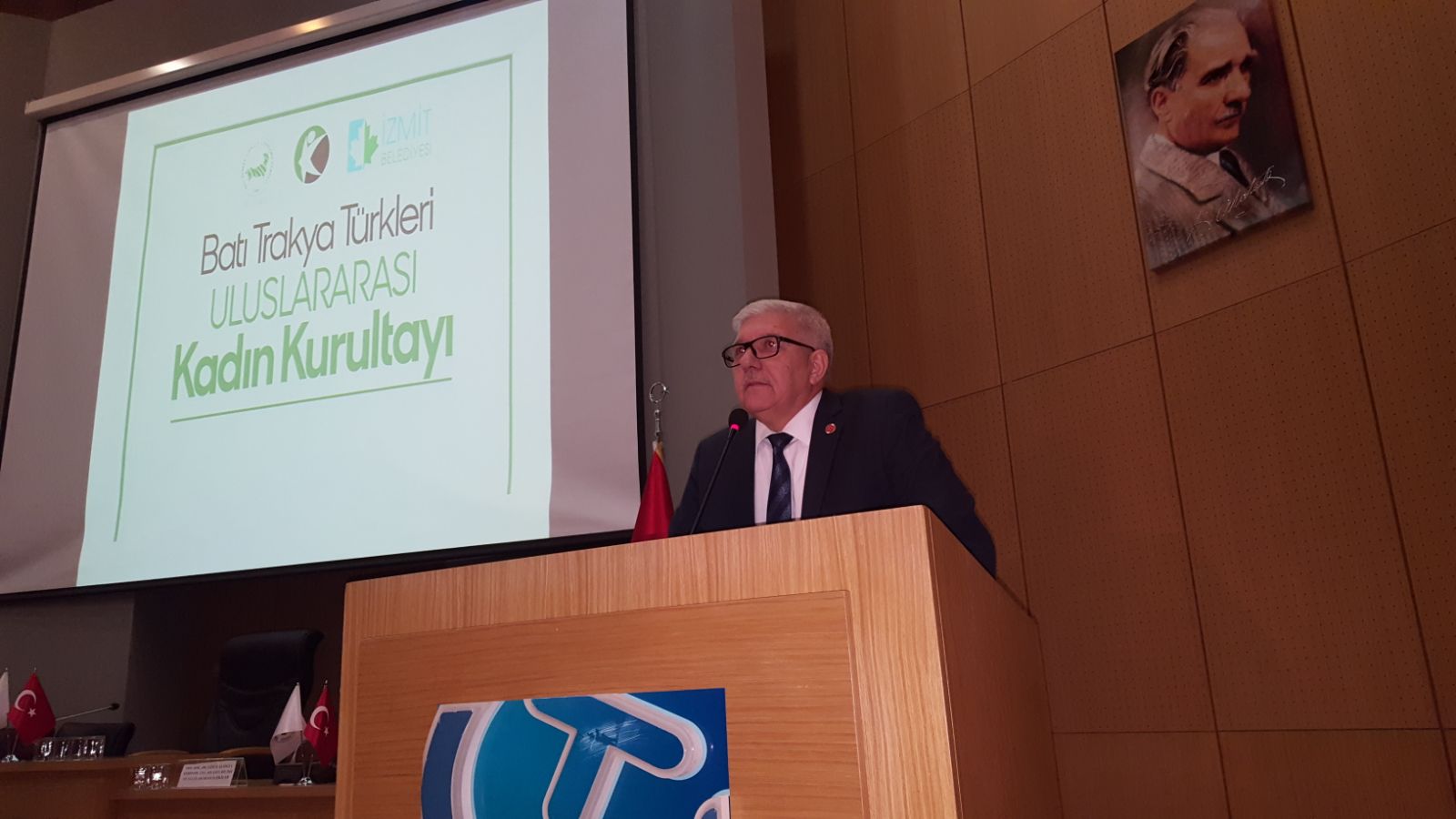 Ben bugün buraya gelen gece zamanını yollarda geçiren herkese çok teşekkür ediyorum. İzmit Belediyemize bize bu imkanı sağladığı için katkılarından dolayı müteşekkiriz. Üç yıl içerisinde yapmış olduğumuz dokuz yüzün üzerinde etkinlik var ve bunların önemli bir kısmında İzmit Şubemizin imzası var, İzmit Şubemize teşekkür ediyorum. Önemli bir kısmında Bursa, Soma, Zeytinburnu, Üsküdar şubemizin etkinliği var. El birliği ile hep birlikte aktiviteleri arttırarak yapıyoruz. Bakın dokuz yüz etkinlikten bahsediyorum ama size vereceğim önemli bir ölçü de var dokuz yüz etkinliğin yüzde on beşinde de bizzat kadınlarımız var. Başta Genel Merkez Kadın Kollarımız olmak üzere, bu kurultayın tüm yükünü çeken İzmit Kadın Kollarımıza, yüne bu süreçte aktif olarak çalışan Soma ve Bursa Kadın Kollarımıza da yürekten teşekkür ediyorum. Bugün değerli hocalarımız var burada, onlarda katkı sunacaklar, onların yüreklerini o kadar sıcak o kadar güzel buluyorum ki inşallah ilk kurultayda olduğu gibi bir kısmı bu kurultayda bizimle onlara katıldıkları için çok teşekkür ediyorum. Federasyonumuza çok teşekkür ediyorum çünkü bu işin üçlü saç ayağı olduğunu bir kez daha tescillediğimiz için. Çünkü bizim ana kurultayımızda söylediğimiz şey şuydu; Türkiye’de Batı Trakya Türkleri Dayanışma Derneği bu davanın çatı kuruluşudur, Avrupa’da; Avrupa Batı Trakya Türk Federasyonu, Batı Trakya’da da Azınlık Danışma Kurulu çatısı altındaki tüm derneklerimiz. Bugün burada yine federasyonumuzun temsilcileri burada, yine Azınlık Danışma Kurulu çatısı altındaki tüm sivil toplum örgütlerimizin kadın kuruluşları burada. Böyle bir güzelliği başka bir yerde yakalamak mümkün değildir. Bu davalarda mücadele zor iş ama birlikteliği yürütmek çok daha zor iştir. Batı Trakya Türkleri Dayanışma Derneği de 72 yıllık bir kurum. Kökleri sağlamdır. Bu tecrübe ile sabittir. Biz şuna inanıyoruz bazen gün gelir sert rüzgarlar eser, bazen başka sıkıntılar yaşarsınız ama kökleri sağlam olan kuruluşlarda ancak esen rüzgarlar, kopan fırtınalar sizin tozunuzu alır götürür. Bu böyle bilinmelidir, bu hayatın gerçeğidir. Ben burada beş komisyon adı altında yapılacak çalışmalarda son derece güzel tespitlerin ve çözüm önerilerinin geleceğini düşünüyorum. Dört ay önce bu sene kurultaylar yılı olsun demiştim. Biz büyük kurultayımızda kadın konusunu hiç ele almamıştık. Büyük kurultayımıza gitmeden önce Türkiye’de ilk Kadın kurultayımızı yapalım, ikincisi yine büyük kurultayımızda hiç ele alamadığımız Gençlik Kurultayımızı yapalım demiştim, o da geliyor bekleyin ve üçüncü adımda da Çocuk Kurultayını da yapacağız dedim ve en sonunda büyük kurultay ile bu üç konu hazır olarak, pişirilmiş olarak büyük kurultayımızın gündemi olacak dedim. Çünkü bu kurultaylarda dinamizmi değişikliği getirmeliyiz, daha interaktif karşılıklı fikir alışverişlerinin daha fazla olduğu ve sonuçları tartışarak, çözüm önerileri üreterek gerçekten birbirimize yeni fikirler aşılayarak geleceğe bakmamız gerekiyor. Ben kurultayımızın çok başarılı olacağına inanıyorum, herkes görecektir ilk kurultayımızın sonuçlarına baktığımız ortaya konan tespitlerle ikinci kurultayımızın sonuçlarını yayınladığımızda gerçekten çok daha geniş bir perspektifte önemli tespitlerin yer alacağını düşünüyorum. Bu duygu ve düşüncelerle Kurultayımızın camiamıza hayırlı olmasını temenni ediyorum” dedi.